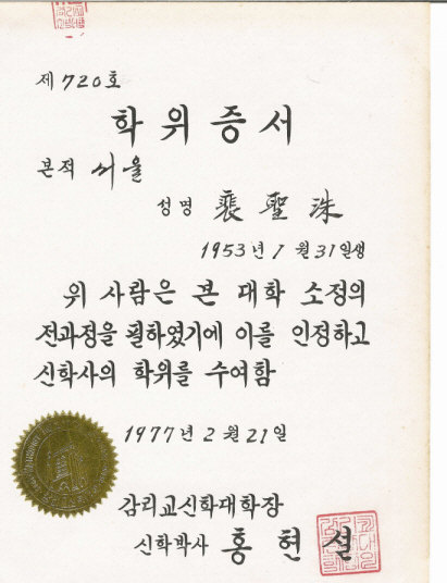 | 1973.3-1977.2 | 감리교신학대학 졸업 | 신학사 | ||||