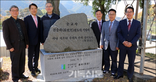 권중하 전도사 순교기념비 곁에 선 여섯 교회 목회자들. 왼쪽부터 원용석(춘산) 라영수(산운) 김현덕(금천) 안해호(현리) 고관규(중리) 정권억(효선) 목사. (출처 : 주간기독신문(https://www.kidok.com)
